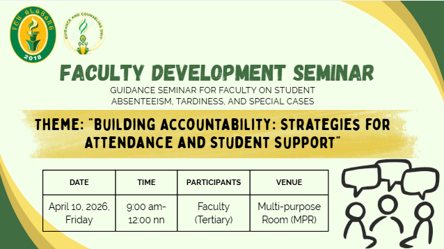 This seminar is designed to equip the Faculty with the knowledge and tools to understand the causes of student absenteeism, implement effective interventions, and promote both student well-being and academic success. This initiative responds to the rising number of referred and walk-in cases of student absenteeism. We believe that through awareness and collaboration, this issue can be effectively addressed.