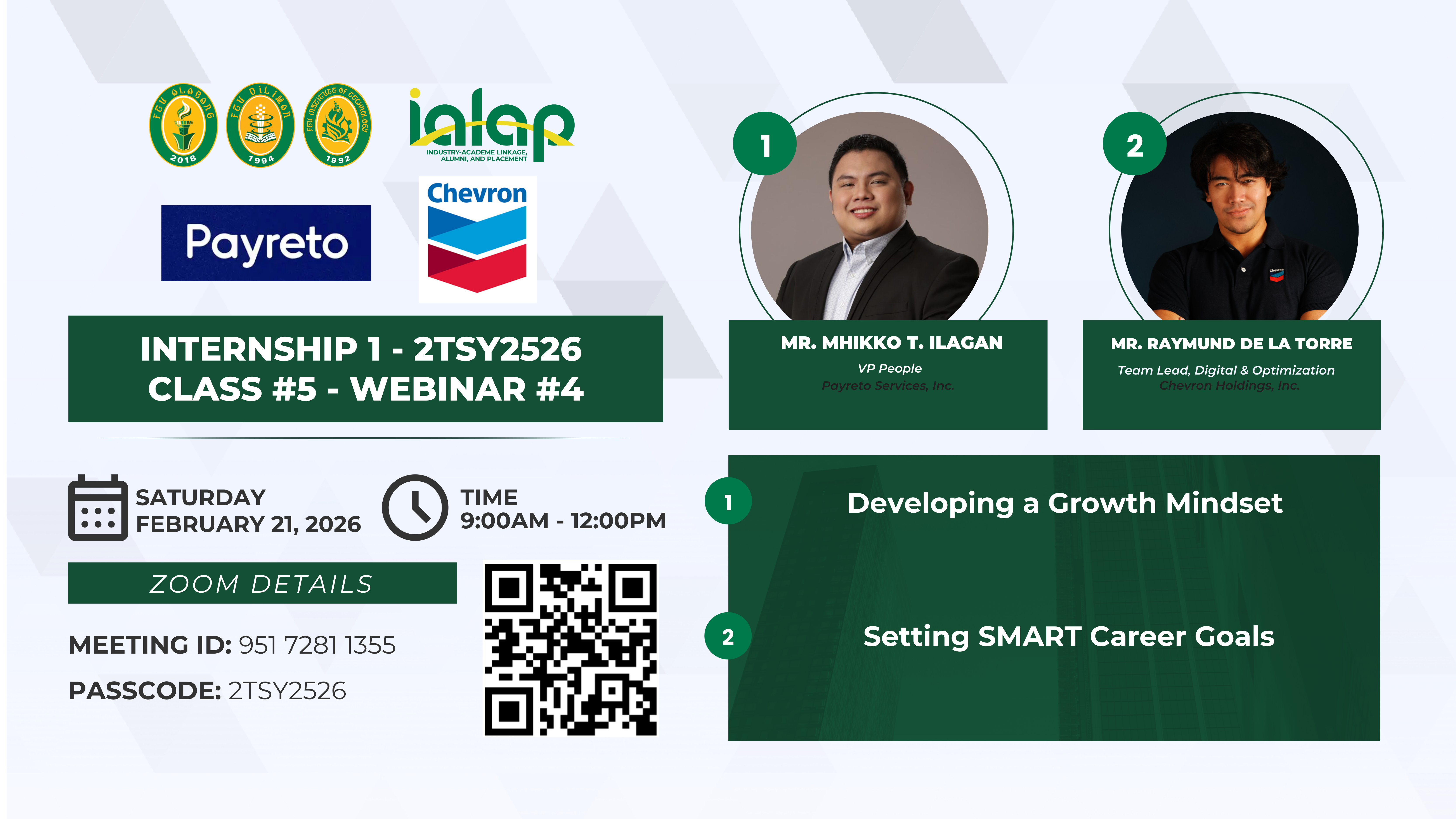 The Industry—Academe Linkage, Alumni and Placement Office (IALAP), in partnership with Payreto Services Inc. and Chevron Holdings Inc., invites you to our upcoming internship webinar scheduled as part of Saturday Class #5 & Webinar #4 for Internship 1 students of 2TSY2526. The webinar will be held on February 21, 2026, from 9:00 AM to 12:00 PM via Zoom.