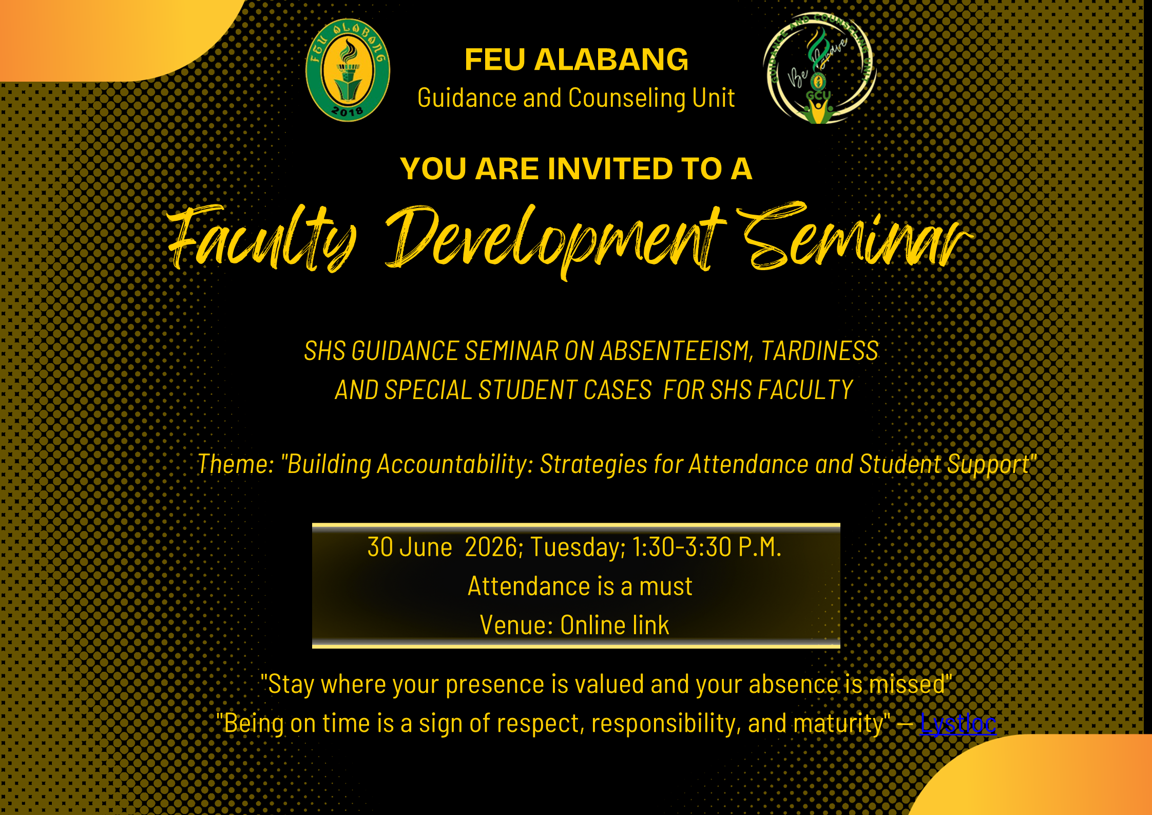 For all Senior High School teachers as part of our continued commitment to strengthening student support and enhancing classroom success. This initiative aims to deepen the faculty’s understanding of the psychological factors behind absenteeism, tardiness, and selected student special cases, enabling us to respond with greater clarity, empathy, and effectiveness